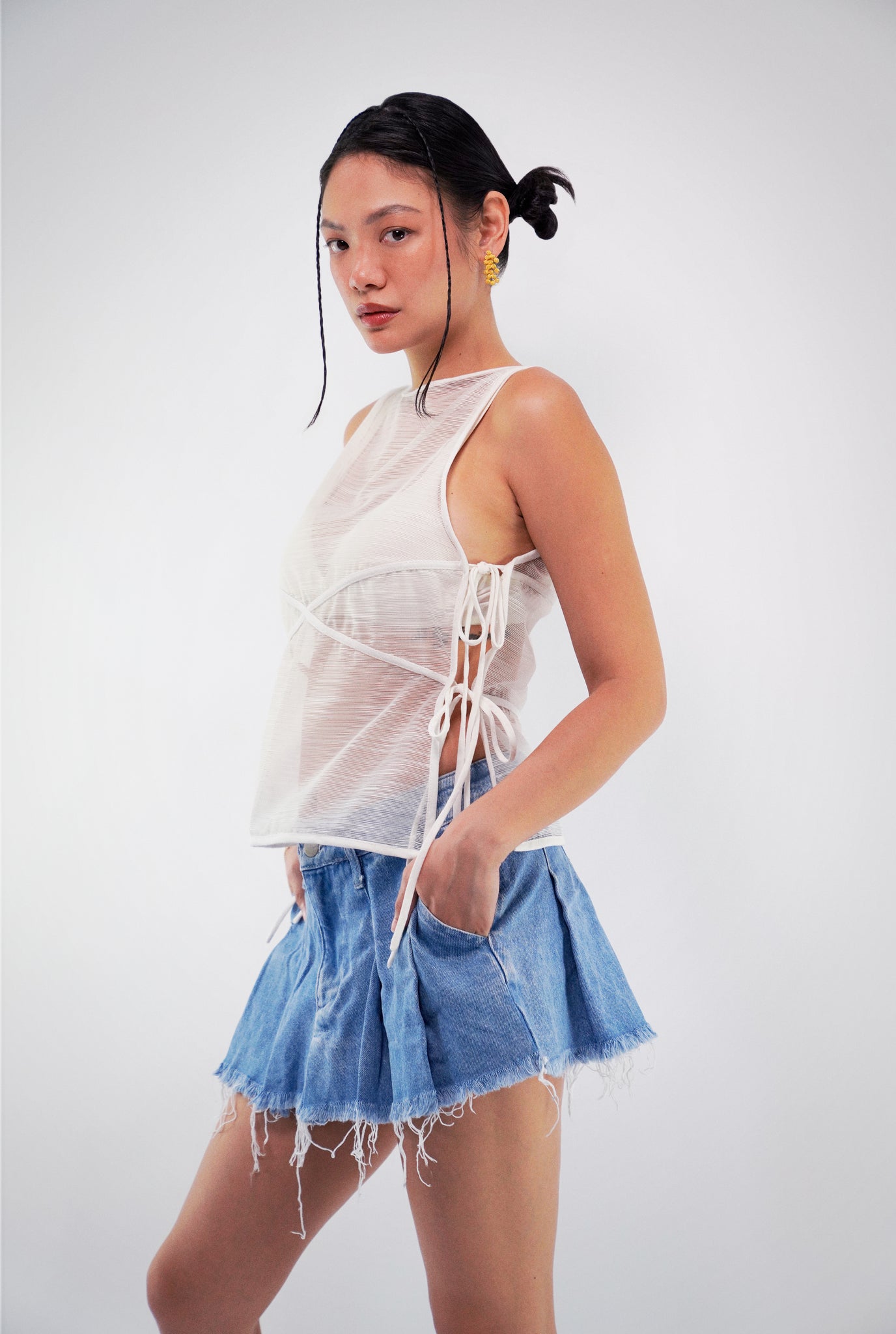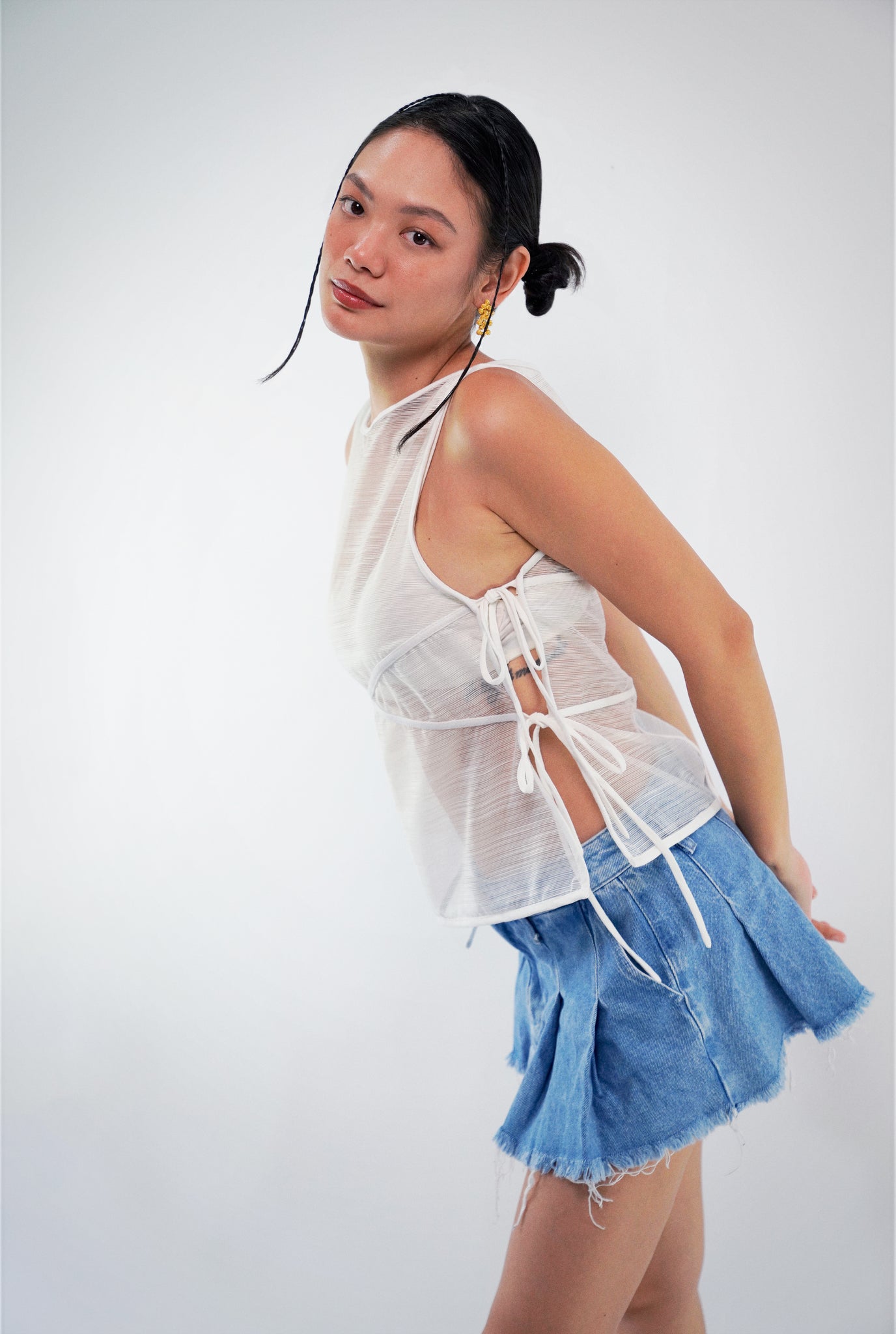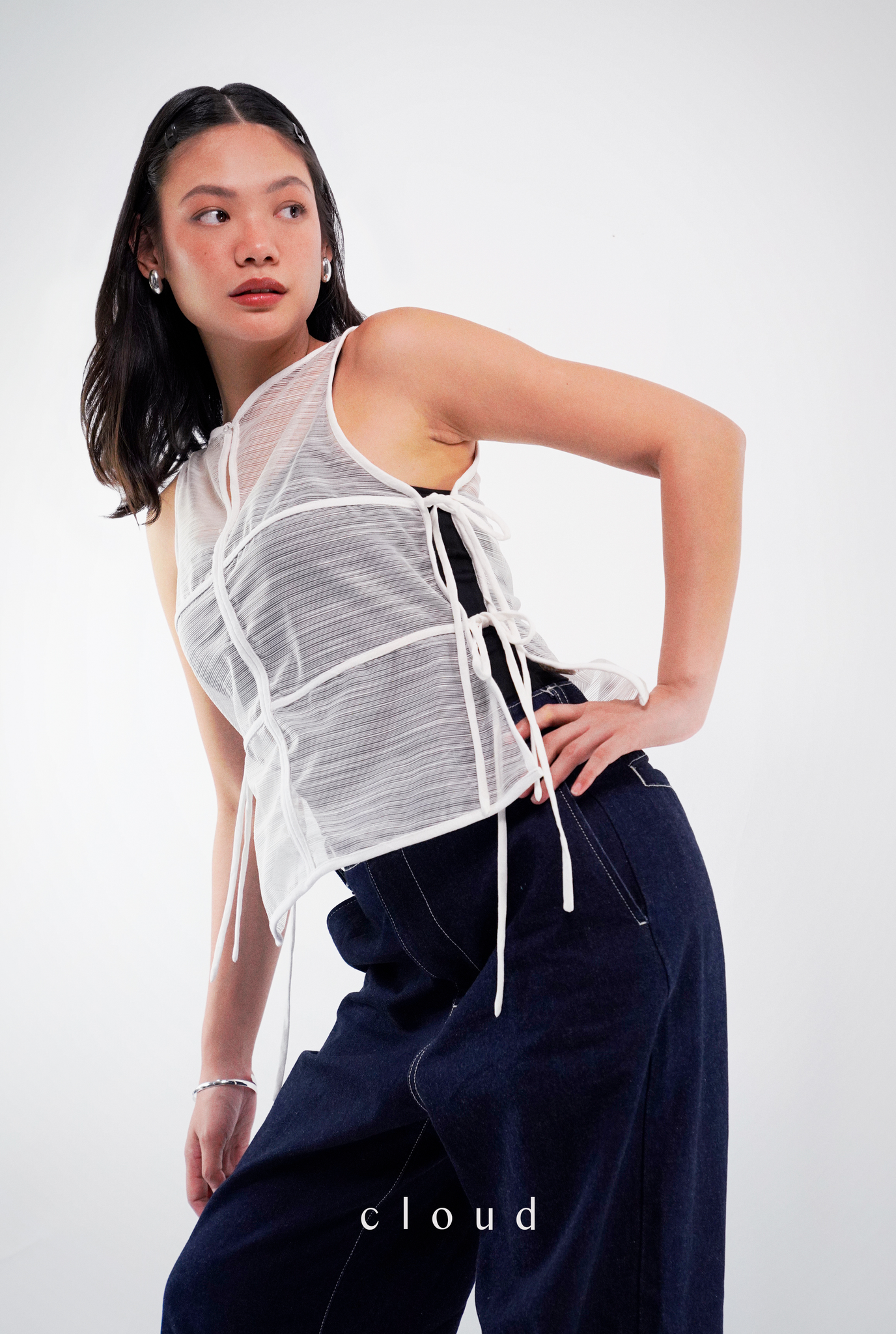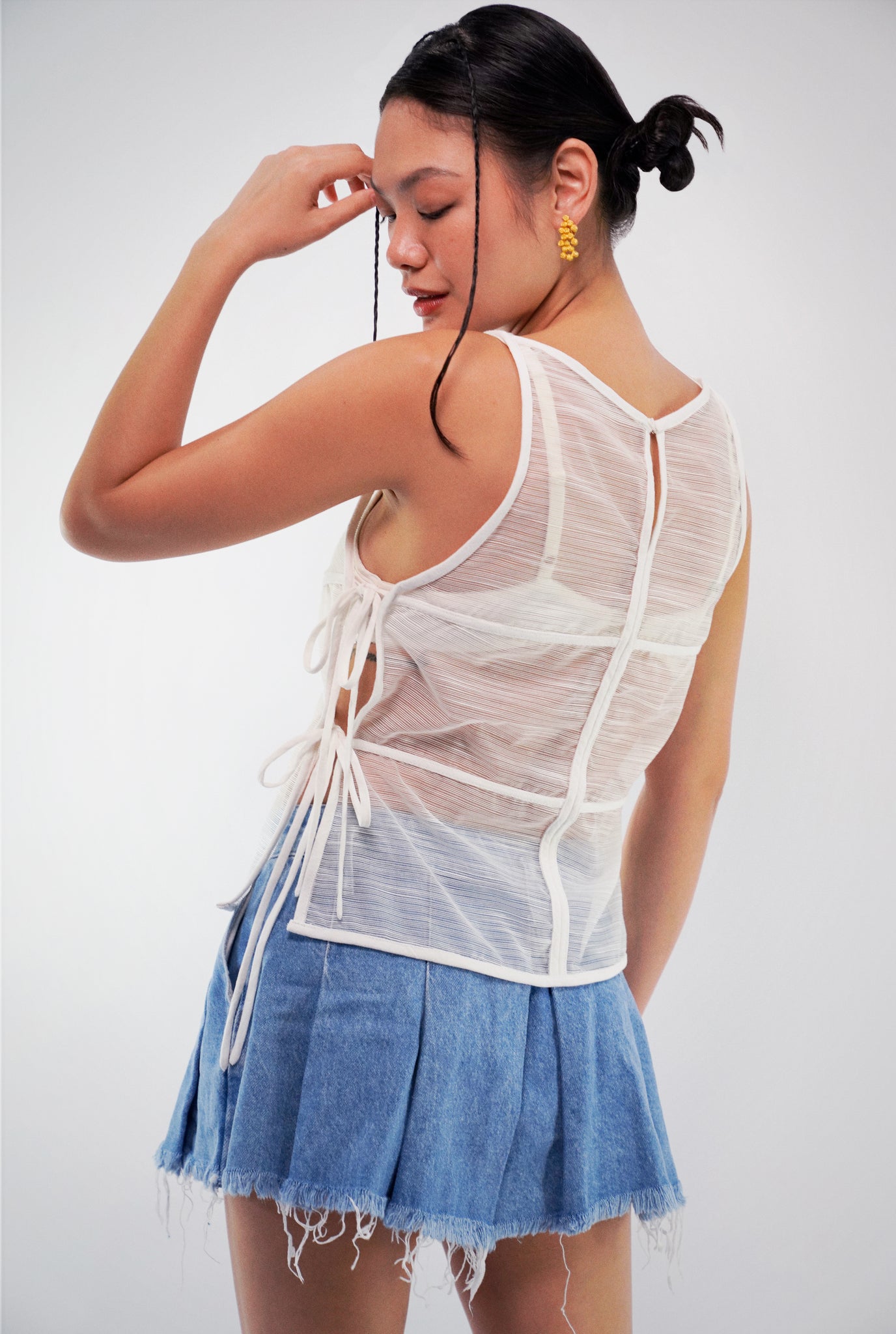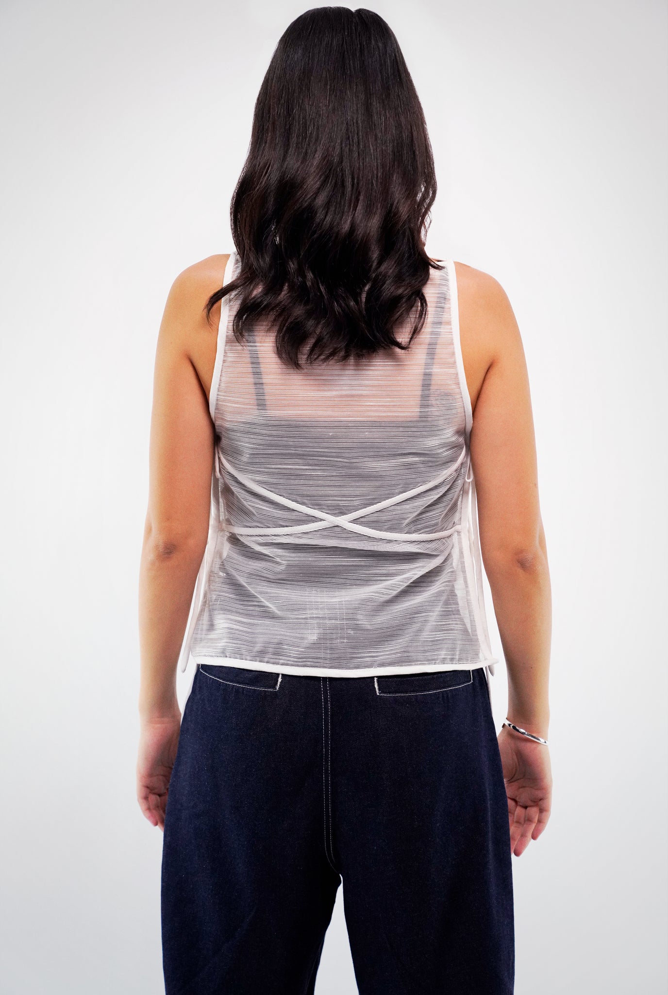 A sheer, airy top with adjustable ribbon ties for a customizable fit. Wear it two ways--one side features grid paneling for a structured look, while the other has X-seam lines for a playful, flattering frame. Perfect for layering over bralettes or tanks, this piece adds texture and dimension to any outfit.