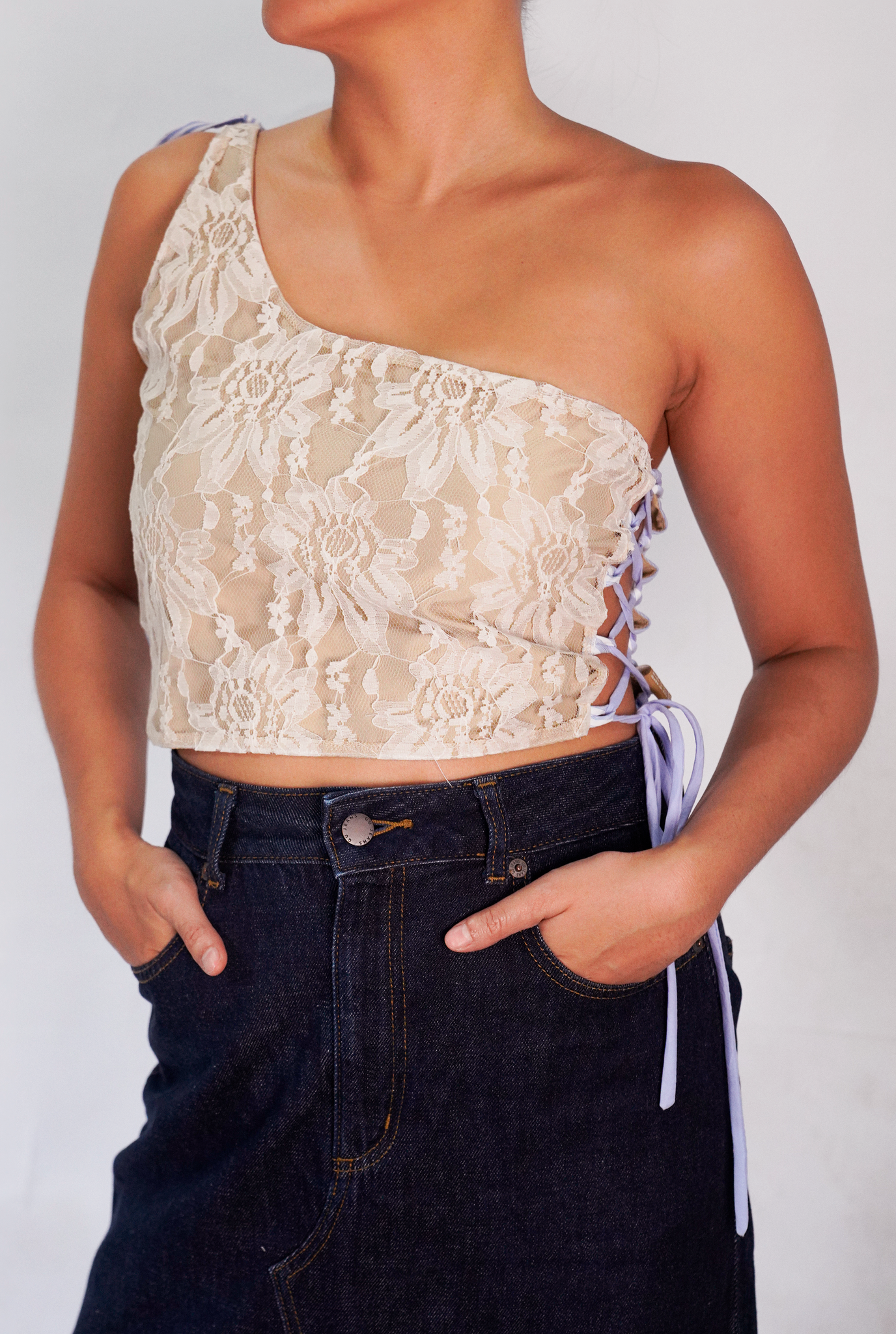 A 3-in-1 piece you can wear as a halter or one-sided top. Get the perfect fit with its adjustable ribbon strap and side tie.